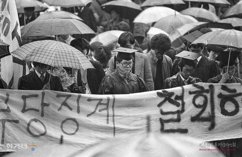 - 1989년 2울 25일 서울대 졸업생과 학부모들이 총학생회와 졸업준비위원회가 교내 아크로폴리스 광장에서 졸마련한 졸업생 한마당을 가진 뒤 등록금 동결과 총학생회의 졸업식 참여, 총학장 직전제, 교원임용보장을 요구하며 대운동장으로 행진 졸업식에 참석하고 있다.