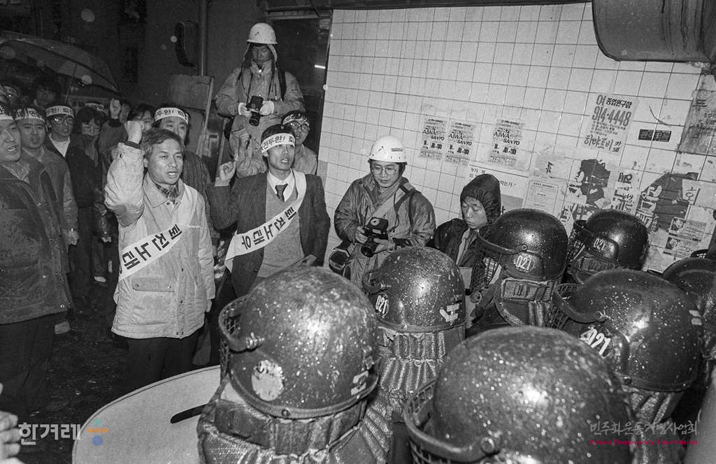 - 1989년 2월 25일 노태우 대통령 취임 1주년을 맞아 전민련 등 재야단체 회원들이 서울 중구 을지로 향린교회에서 노태우정권 규탄대회를 가진 뒤 명동성당까지 거리행진을 벌이려다 경찰의 저지를 받고 있다.