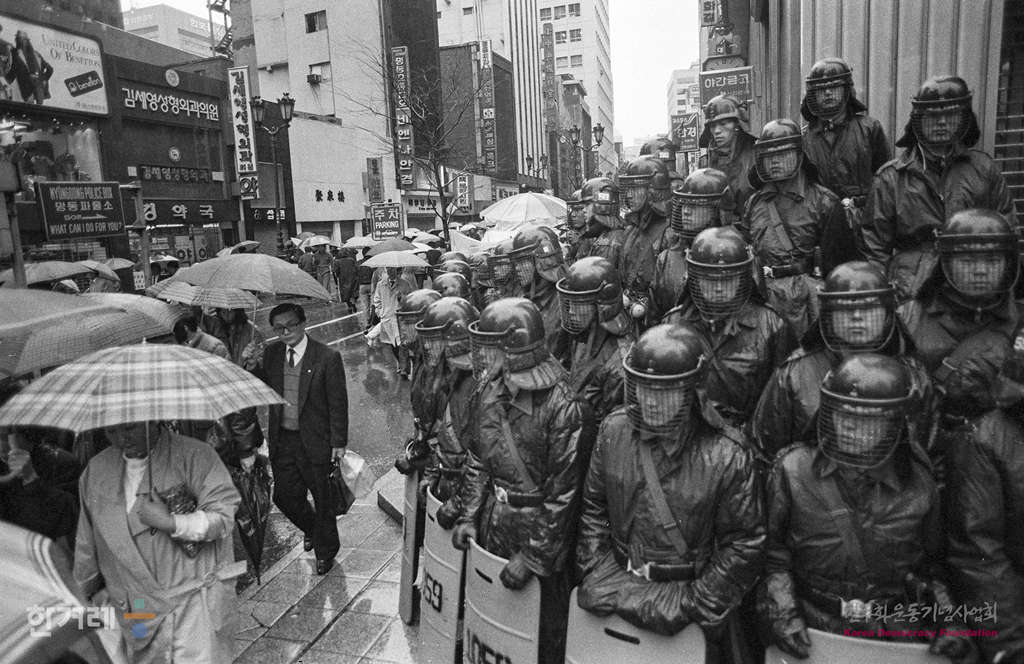 - 1989년 2월 25일 노태우 대통령 취임 1주년을 맞아 전민련 등 재야단체 회원들이 서울 중구 을지로 향린교회에서 노태우정권 규탄대회를 가진 뒤 명동성당까지 거리행진을 벌이려다 경찰의 저지를 받고 있다.