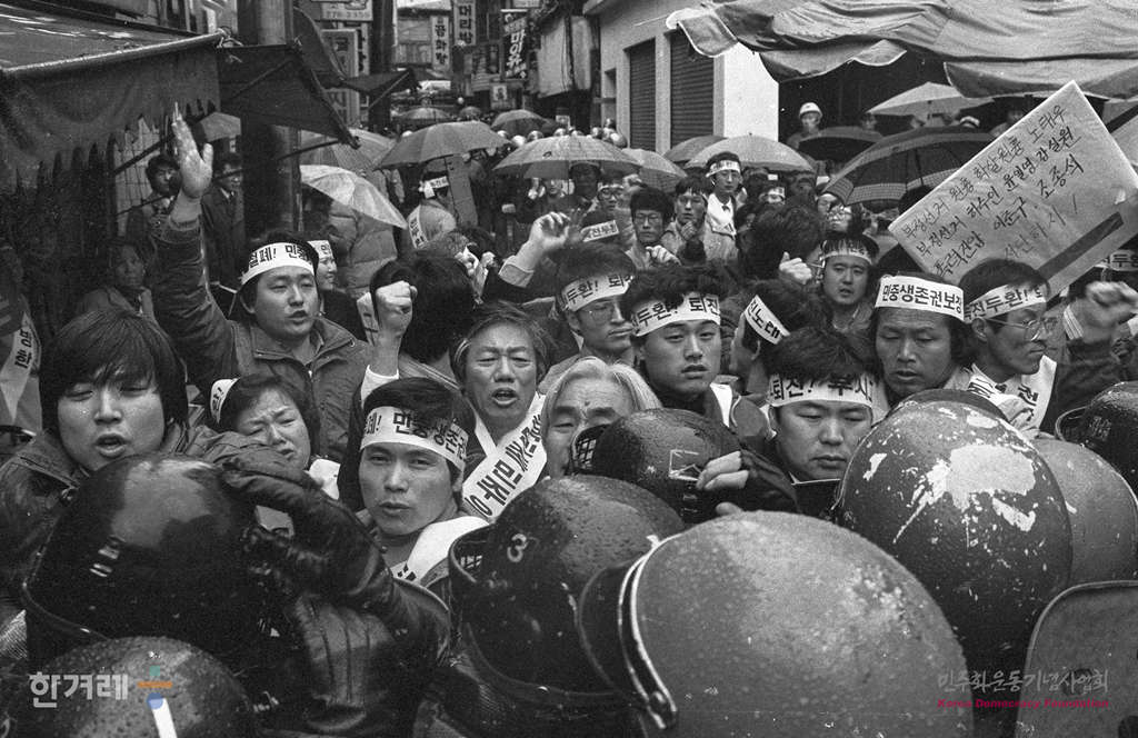 - 1989년 2월 25일 노태우 대통령 취임 1주년을 맞아 전민련 등 재야단체 회원들이 서울 중구 을지로 향린교회에서 노태우정권 규탄대회를 가진 뒤 명동성당까지 거리행진을 벌이려다 경찰의 저지를 받고 있다.