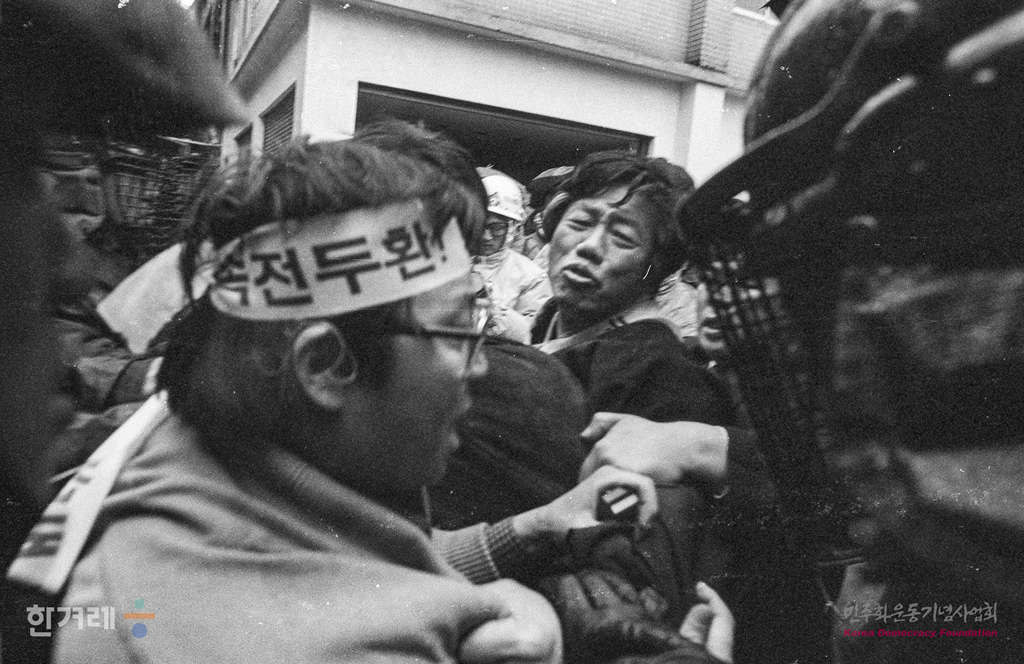 - 1989년 2월 25일 노태우 대통령 취임 1주년을 맞아 전민련 등 재야단체 회원들이 서울 중구 을지로 향린교회에서 노태우정권 규탄대회를 가진 뒤 명동성당까지 거리행진을 벌이려다 경찰의 저지를 받고 있다.