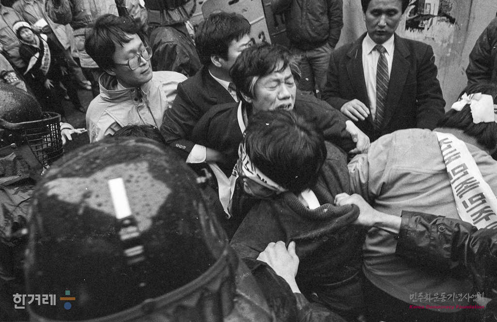 - 1989년 2월 25일 노태우 대통령 취임 1주년을 맞아 전민련 등 재야단체 회원들이 서울 중구 을지로 향린교회에서 노태우정권 규탄대회를 가진 뒤 명동성당까지 거리행진을 벌이려다 경찰의 저지를 받고 있다.