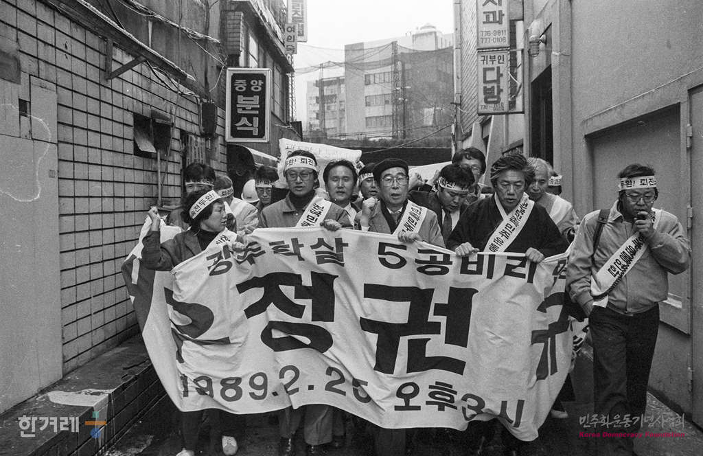 - 1989년 2월 25일 노태우 대통령 취임 1주년을 맞아 전민련 등 재야단체 회원들이 서울 중구 을지로 향린교회에서 노태우정권 규탄대회를 가진 뒤 명동성당까지 거리행진을 벌이려다 경찰의 저지를 받고 있다.