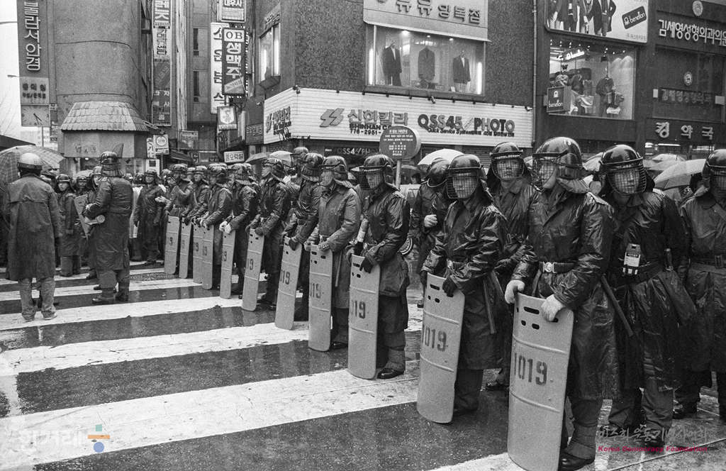 - 1989년 2월 25일 노태우 대통령 취임 1주년을 맞아 전민련 등 재야단체 회원들이 서울 중구 을지로 향린교회에서 노태우정권 규탄대회를 가진 뒤 명동성당까지 거리행진을 벌이려다 경찰의 저지를 받고 있다.