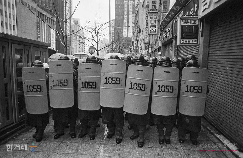 - 1989년 2월 25일 노태우 대통령 취임 1주년을 맞아 전민련 등 재야단체 회원들이 서울 중구 을지로 향린교회에서 노태우정권 규탄대회를 가진 뒤 명동성당까지 거리행진을 벌이려다 경찰의 저지를 받고 있다.