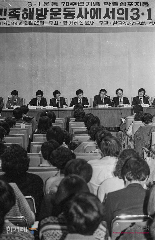 - 1989년 2월 25일 3.1운동 70돌을 기념해 한겨레신문사 주최로 서울 프레스센터 국제회의장에서 열린 학술심포지움 ‘민족해방운동사에서의 3.1운동 평가’에서 3.1운동 평가를 둘러싼 주요한 현안을 주제발표 및 토론을 하고 있다. 한겨레신문은 한국역사연구회와 역사문제연구소 소속 소장학자들과 지난 1년여 걸쳐 공동작업으로 연구했다.