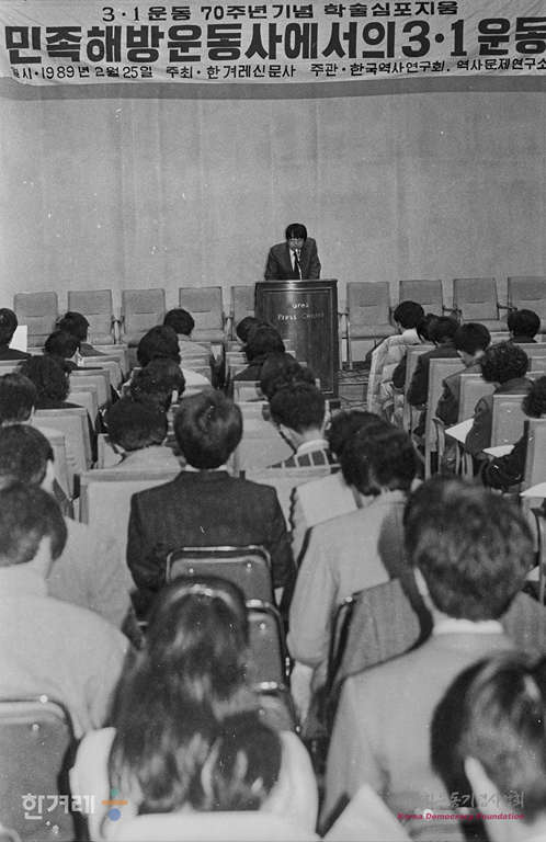 - 1989년 2월 25일 3.1운동 70돌을 기념해 한겨레신문사 주최로 서울 프레스센터 국제회의장에서 열린 학술심포지움 ‘민족해방운동사에서의 3.1운동 평가’에서 3.1운동 평가를 둘러싼 주요한 현안을 주제발표 및 토론을 하고 있다. 한겨레신문은 한국역사연구회와 역사문제연구소 소속 소장학자들과 지난 1년여 걸쳐 공동작업으로 연구했다.
