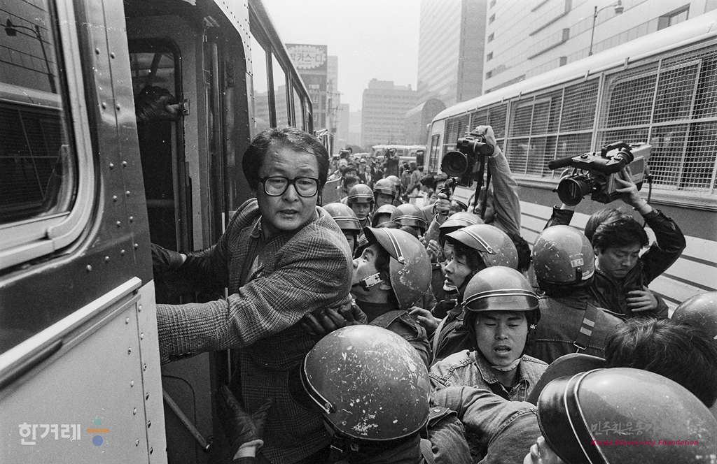 - 1989년 2월 27일 낮 12시 전민련의 이부영 오충일 공동의장과 최장학 서울민통련의장 등 재야단체 의장단과 회원 43여명은 서울 종로구 세종로 교보문고 앞에 모여 부시미대통령의 방한을 반대하는 피켓시위를 벌이고 공개항의서를 전달하기 위해 미대사관쪽으로 행진하려다 경비중인 경찰에 의해 연행되고 있다.