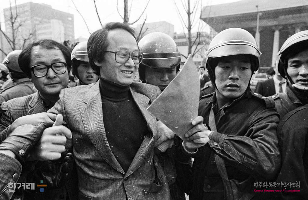 - 1989년 2월 27일 낮 12시 전민련의 이부영 오충일 공동의장과 최장학 서울민통련의장 등 재야단체 의장단과 회원 45여명은 서울 종로구 세종로 교보문고 앞에 모여 부시미대통령의 방한을 반대하는 피켓시위를 벌이고 공개항의서를 전달하기 위해 미대사관쪽으로 행진하려다 경비중인 경찰에 의해 연행되고 있다.