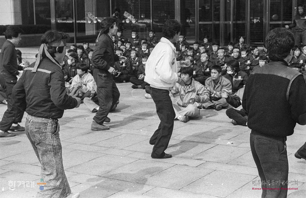 - 1989년 2월 27일 현대중공업 노동자 2백여명은 정주영 회장 면담을 요구하며 서울 종로구 계동 현대 본사 앞마당에 누워 농성을 벌이고 있다.