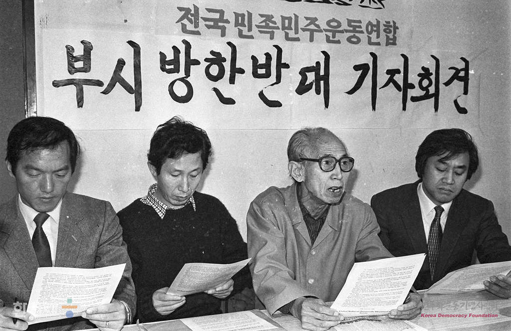 - 1989년 2월 27일 계훈제씨를 비롯한 전민련 관계자들이 서울 중구 삼각동 사무실에서 미대통령 부시방한을 반대하며 연행된 전민련 회원 30여명의 석방을 촉구하며 기자회견을 하고 있다. 이들은 기자회견을 마친 뒤 밤생농성을 이어갔다.
