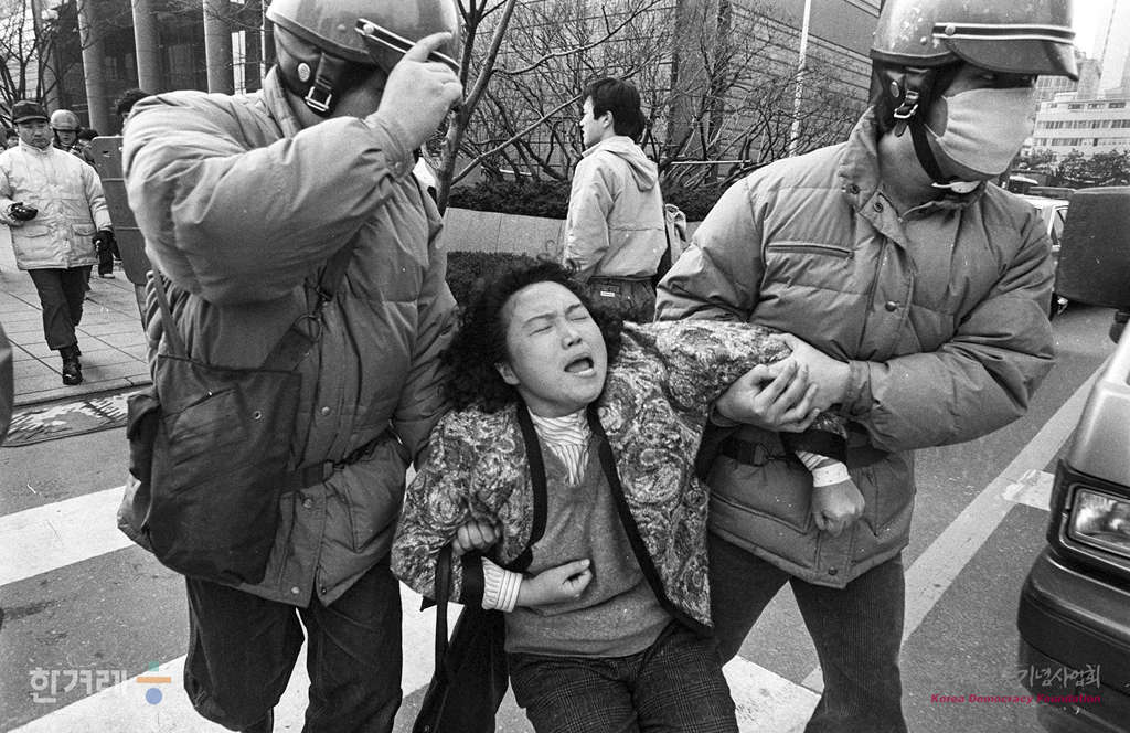 - 1989년 2월 27일 낮 12시 전민련의 이부영 오충일 공동의장과 최장학 서울민통련의장 등 재야단체 의장단과 회원 40여명은 서울 종로구 세종로 교보문고 앞에 모여 부시미대통령의 방한을 반대하는 피켓시위를 벌이고 공개항의서를 전달하기 위해 미대사관쪽으로 행진하려다 경비중인 경찰에 의해 연행되고 있다.