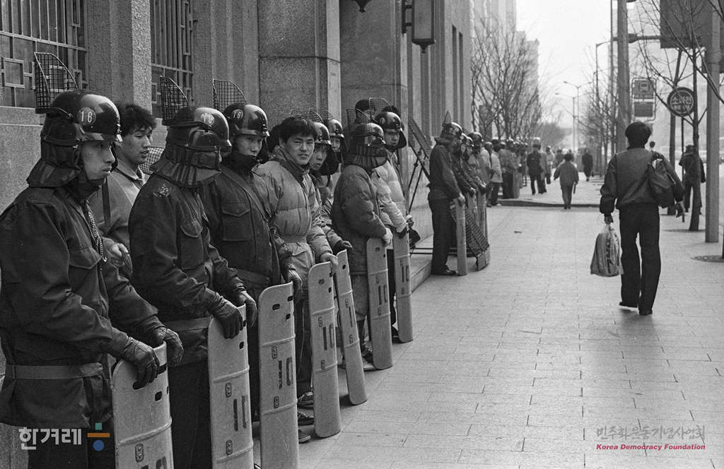 - 1989년 2월 27일 부시 미대통령이 방한을 규탄 반대하는 재야단체 및 대학생들의 집회와 성명이 잇따르는 가운데 경찰이 갑호비상령을 내리고 1백30여개 중대 2만여명의 경찰력을 동원해 거리시위를 원천봉쇄하고 있다.