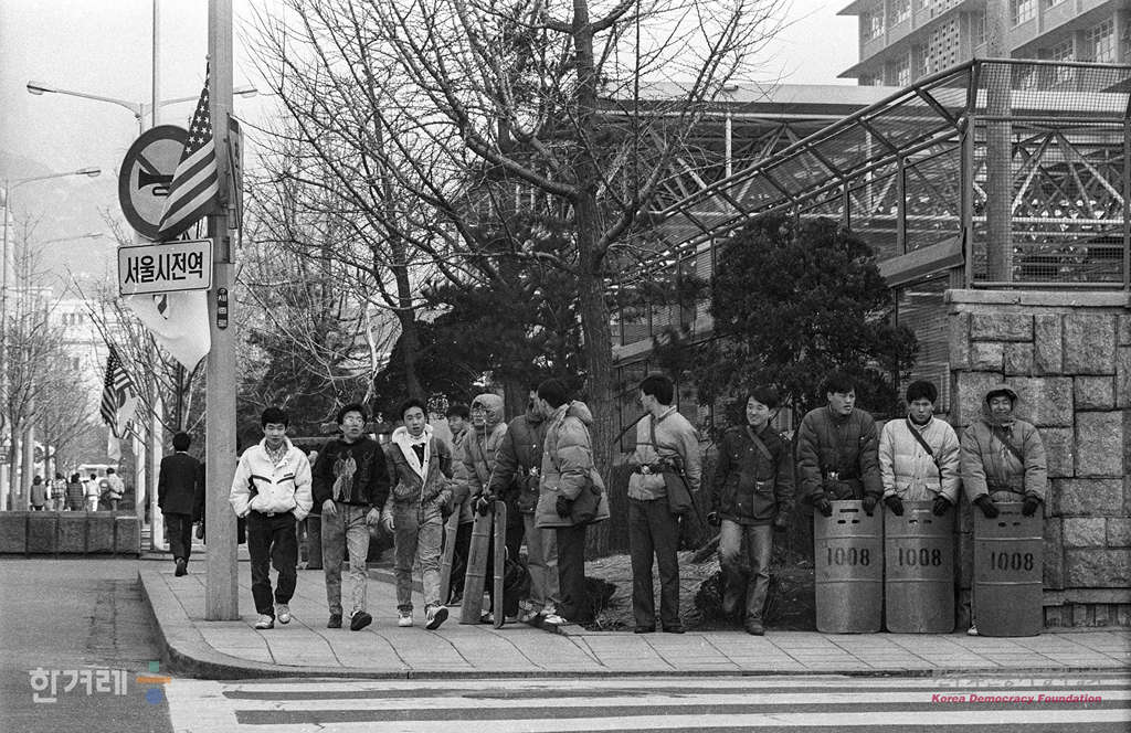 - 1989년 2월 27일 부시 미대통령이 방한을 규탄 반대하는 재야단체 및 대학생들의 집회와 성명이 잇따르는 가운데 경찰이 갑호비상령을 내리고 1백30여개 중대 2만여명의 경찰력을 동원해 거리시위를 원천봉쇄하고 있다.