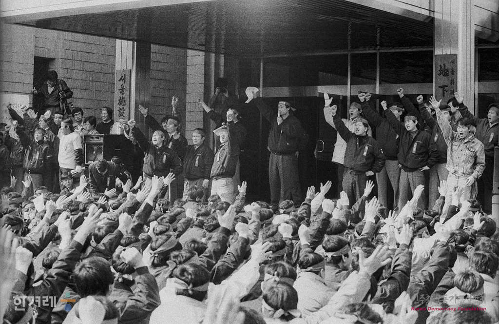 - 1989년2월 28일 오전 10시 30분 서울지하철공사의 직제개편 합의각서 이행문제를 둘러싼 노사대립이 심화되고 있는 가운데 서울지하철공사 노조 조합원들이 서울 방배동 공사 건물 안에 들어가 농성을 하고 있다.
