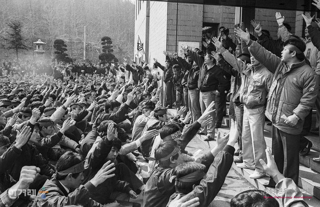 - 1989년2월 28일 오전 10시 30분 서울지하철공사의 직제개편 합의각서 이행문제를 둘러싼 노사대립이 심화되고 있는 가운데 서울지하철공사 노조 조합원들이 서울 방배동 공사 건물 안에 들어가 농성을 하고 있다.