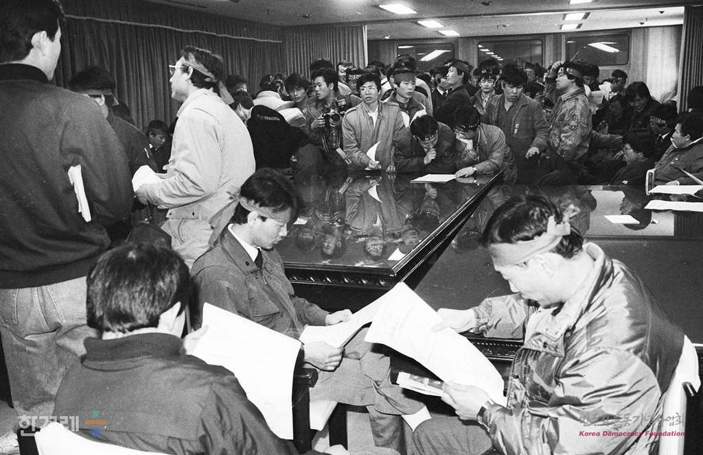 - 1989년2월 28일 오전 10시 30분 서울지하철공사의 직제개편 합의각서 이행문제를 둘러싼 노사대립이 심화되고 있는 가운데 서울지하철공사 노조 조합원들이 서울 방배동 공사 건물 안에 들어가 농성을 하고 있다.