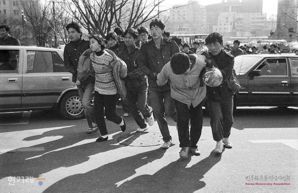 - 1989년 3월 1일 서울지역총학생회연합 소속 학생들이 서울 세종로 미대사관앞 도로에서 팀스프리스 훈련을 반대하며 기습시위를 벌어다 연행되고 있다.