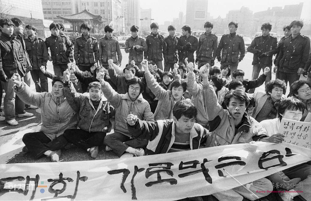 - 1989년 3월 1일 서울지역총학생회연합 소속 학생들이 서울 세종로 미대사관앞 도로에서 팀스프리스 훈련을 반대하며 기습시위를 벌어다 연행되고 있다.