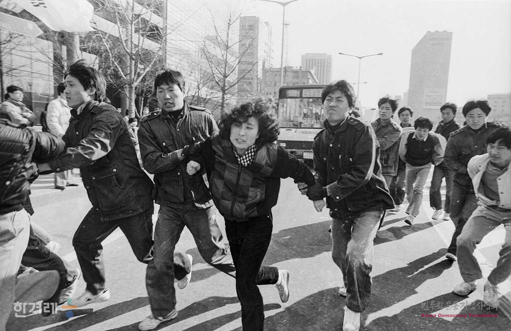 - 1989년 3월 1일 서울지역총학생회연합 소속 학생들이 서울 세종로 미대사관앞 도로에서 팀스프리스 훈련을 반대하며 기습시위를 벌어다 연행되고 있다.