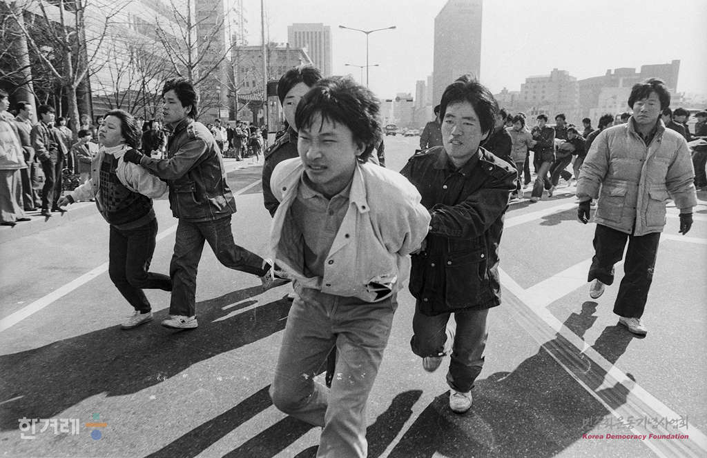 - 1989년 3월 1일 서울지역총학생회연합 소속 학생들이 서울 세종로 미대사관앞 도로에서 팀스프리스 훈련을 반대하며 기습시위를 벌어다 연행되고 있다.