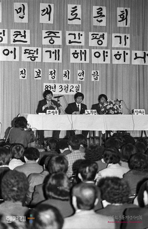 - 1989년 3월 2일 오후6시 진보정치연합은 서울 YWCA강당에서 노태우 정권 중간평가 어떻게 해야하나라는 주제로 시민대토론회를 하고 있다. 이날 토론회에는 노무현의원(민주), 정태윤 진정연 공동대표, 고성국 고대강사가 주제발표를 했다.