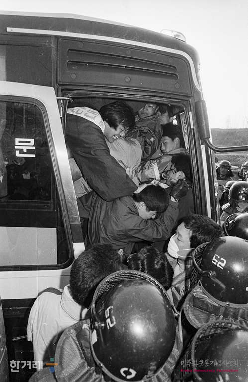 - 1989년 3월 1일 판문점에서 북한의 조국통일위원회와 갖기로 한 범민족대회를 위한 예비회의에 참석하기 위해 전민련의 오충일 공동의장 등 9명이 찬 버스가 판문점으로 향하다 통일로에서 경찰의 저지를 받고 있다. 이들은 5시간여의 대치 끝에 모두 강제 연행됐다.