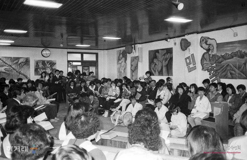 - 1989년 3월 1일 경기도 성남시청앞 주민교회(당회장 이해학목사) 교인들이 3.1운동 70돌과 교회세움 16돌을 맞아 민속예배를 하고 있다. 민속예배는 국악 장단에 맞춘 찬송가와 판소리조 기도문으로 80년대 들어 지역사회운동에 앞장서며 삶의 현장에 뿌리내린 작은교회 민중교회들의 구체적인 토착화 노련의 실험적인 단계로 볼 수 있다.