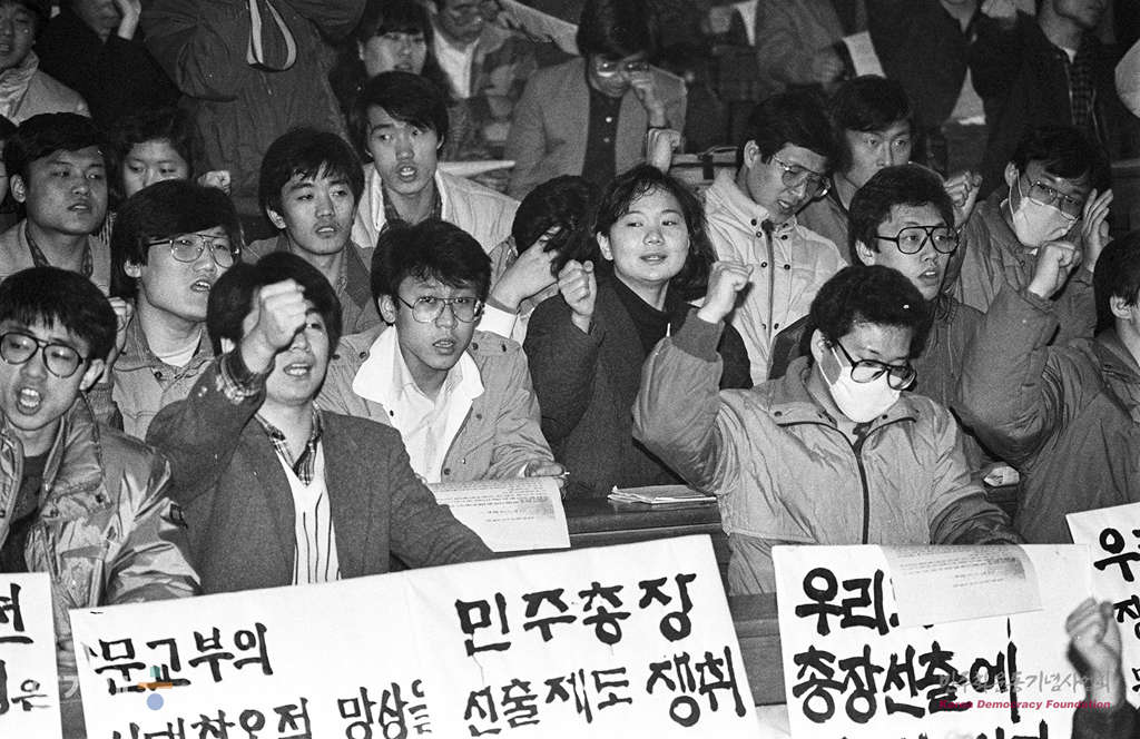 - 1989년 3월 4일 총장선출 문제를 놓고 교수협의회와 직원노조, 총학생회 등 학내 5개 자치단체가 진통을 겪고 있는 고려대에서 직원과 학생들이 교수들이 임시총회장인 경영관 1층 강당을 점거하며 투표저지를 하기 위해 농성을 벌이고 있다.