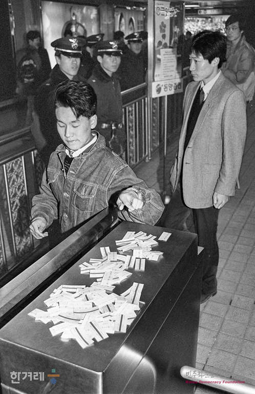 - 1989년 3월 6일 서울 지하철공사 노조가 공사쪽의 합의각서 이행을 요구하며 무임승차 운행을 실시하자 시청직원, 서울지하철공사직원, 경찰 등 업무지원을 나와 승객들에게 표를 사도록 권유하면서 노조원들과 실랑이 벌이고 있다. 이날 노조원들의 홍보와 방송보도 등의 영향으로 시간이 지난에 따라 무료승객이 늘어 오후부터는 대부분의 승객이 표를 사지않고 지하철을 이용했다.