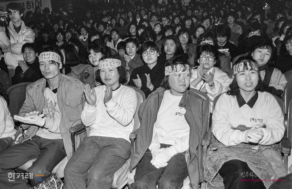 - 1989년 3월 6일 서울지역 노동조합협의회 여성국, 병원노련 여성부,한국여성노동자회 주최로 노동자들과 학생 시민들이 참석한 가운데 3.8서계여성의날 기념으로 차별의 사슬끊고 단결 전진이라는 구호를 외치며 여성노동자전진대회를 하고 있다.