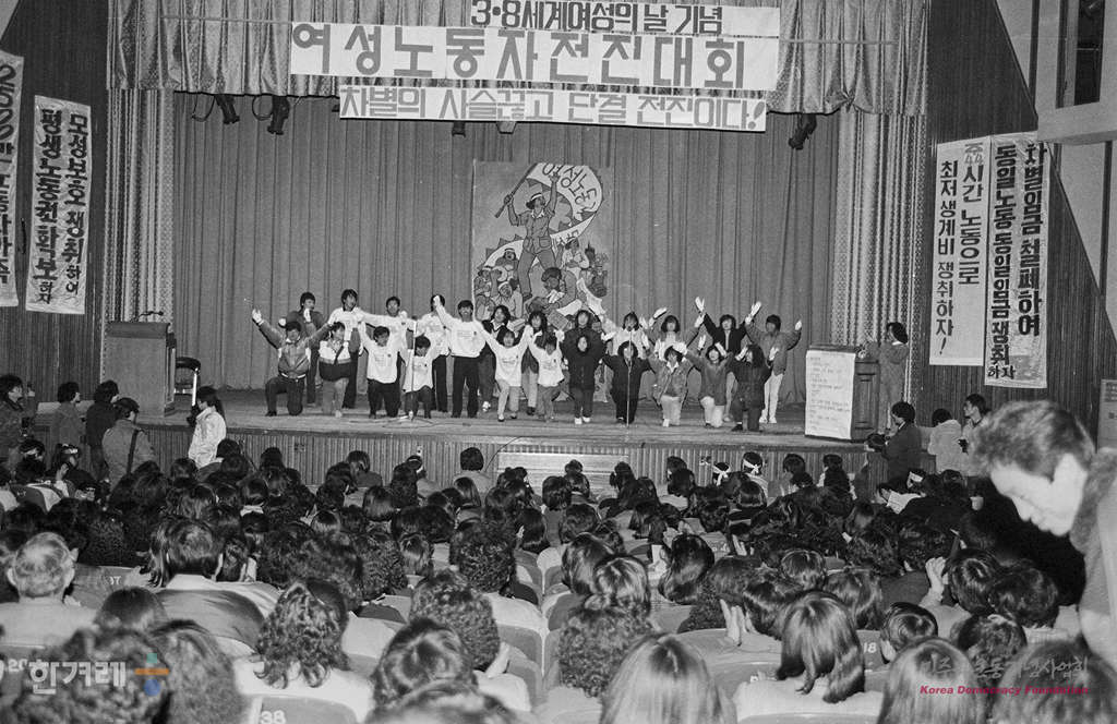 - 1989년 3월 6일 서울지역 노동조합협의회 여성국, 병원노련 여성부,한국여성노동자회 주최로 노동자들과 학생 시민들이 참석한 가운데 3.8서계여성의날 기념으로 차별의 사슬끊고 단결 전진이라는 구호를 외치며 여성노동자전진대회를 하고 있다.