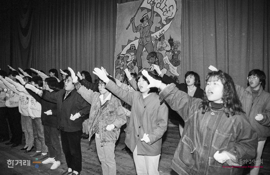 - 1989년 3월 6일 서울지역 노동조합협의회 여성국, 병원노련 여성부,한국여성노동자회 주최로 노동자들과 학생 시민들이 참석한 가운데 3.8서계여성의날 기념으로 차별의 사슬끊고 단결 전진이라는 구호를 외치며 여성노동자전진대회를 하고 있다.