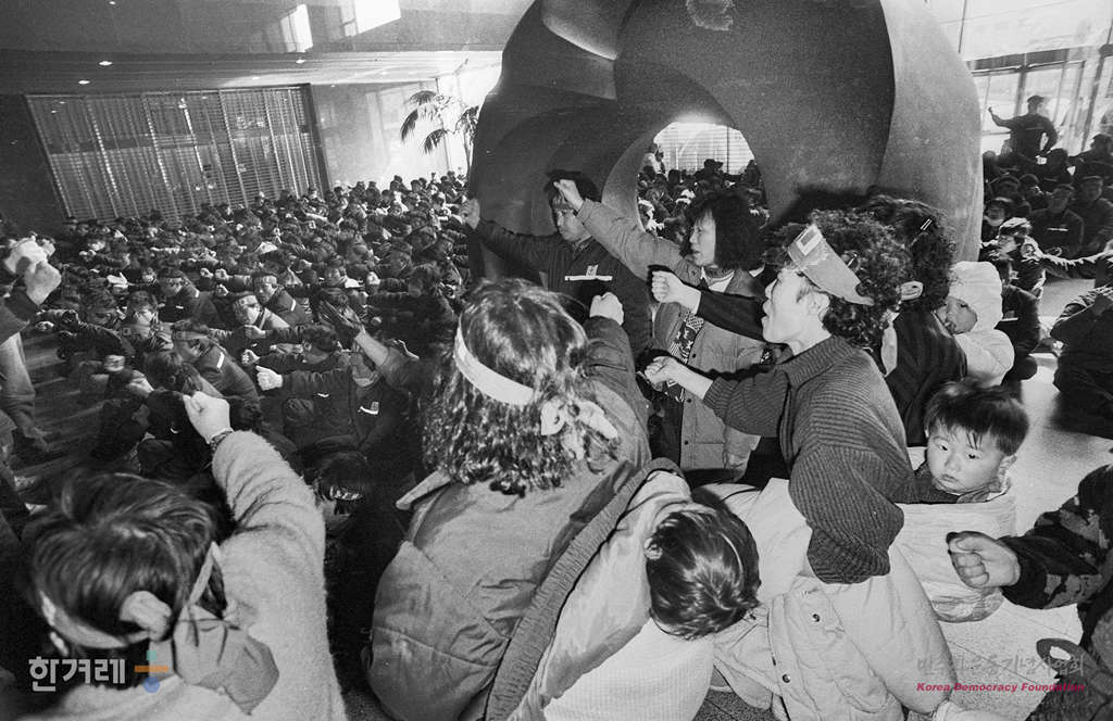 - 1989년 3월 8일 오전 9시 50분 정주영 명에회장 면담을 요구하며 지난달 28일부터 서울 종로구 계동 현대 본사앞에서 텐트 농성중이던 현대중공업 노동자와 가족 등 3백여명이 정사복 경찰 5개중대 8백여명을 동원 강제해산하고 있다.