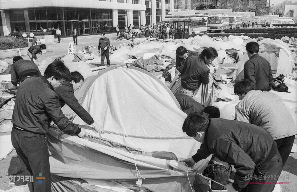 - 1989년 3월 8일 오전 9시 50분 정주영 명에회장 면담을 요구하며 지난달 28일부터 서울 종로구 계동 현대 본사앞에서 텐트 농성중이던 현대중공업 노동자와 가족 등 3백여명이 정사복 경찰 5개중대 8백여명을 동원 강제해산하고 있다.
