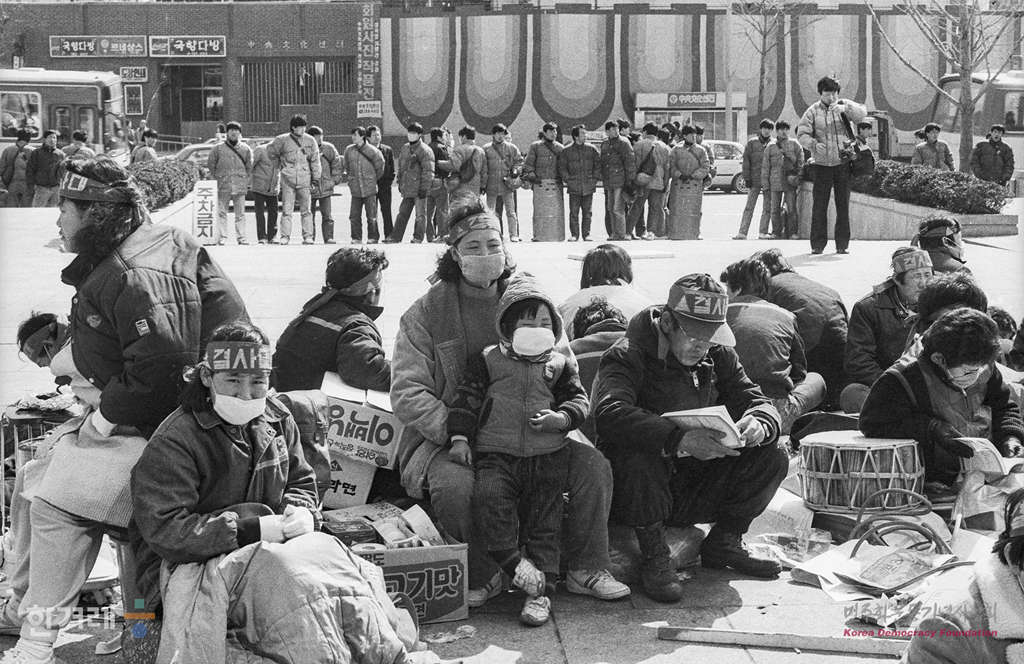 - 1989년 3월 8일 오전 9시 50분 정주영 명에회장 면담을 요구하며 지난달 28일부터 서울 종로구 계동 현대 본사앞에서 텐트 농성중이던 현대중공업 노동자와 가족 등 3백여명이 정사복 경찰 5개중대 8백여명을 동원 강제해산하고 있다.