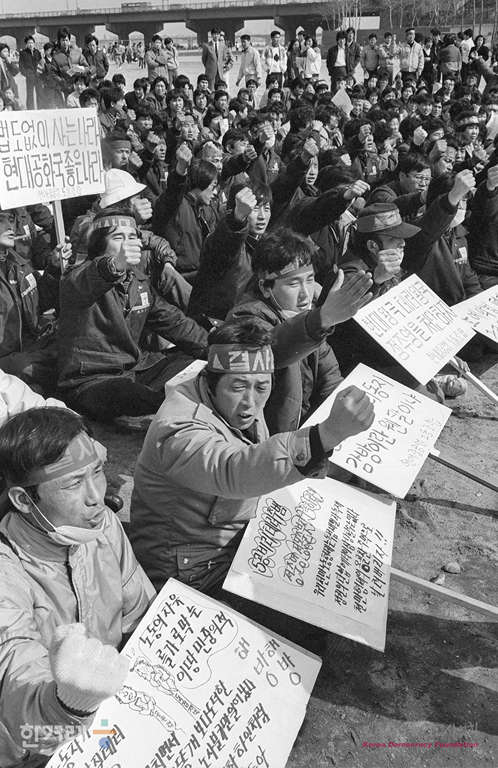 - 1989년 3월 10일 오전 10시 전국 노동법개정 및 임금인상투쟁본부가 주최한 89년 임금인상투쟁 전진대회가 서울 여의도 고수부지에서 열려 서울 비롯한 수도권지역 노동자들이 참여해 전국적인 노동자조직 건설과 무노동무임금 정책과 노동악법 철폐를 요구하고 있다.