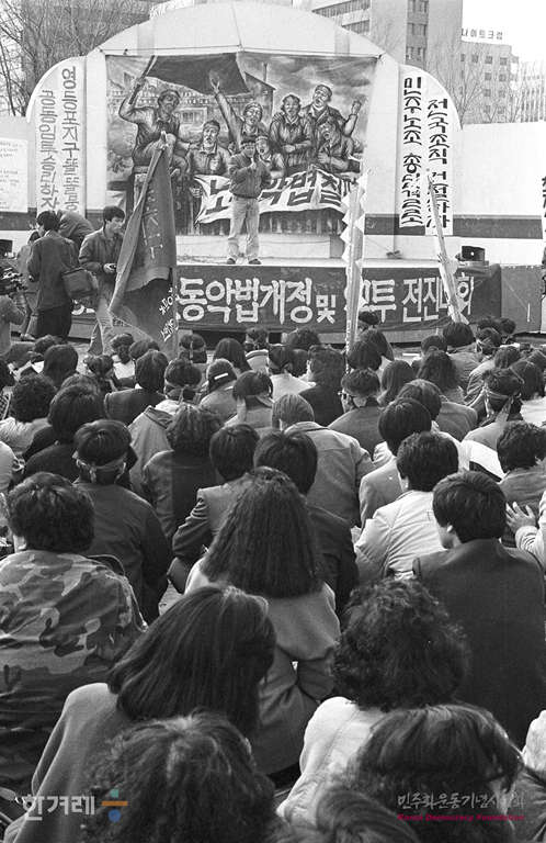 - 1989년 3월 10일 오전 10시 전국 노동법개정 및 임금인상투쟁본부가 주최한 89년 임금인상투쟁 전진대회가 서울 여의도 고수부지에서 열려 서울 비롯한 수도권지역 노동자들이 참여해 전국적인 노동자조직 건설과 무노동무임금 정책과 노동악법 철폐를 요구하고 있다.