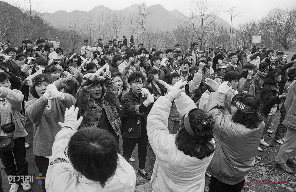 - 1989년 3월 10일 서노협 강북지구 임금인상 투쟁특별위원회 주최로 서울 도봉산에서 89 노동법 개정 및 임금인상 투쟁을 위한 강북지구 노동자 등반대회가 열려 노동자들이 등반에 앞서 구호를 외치고 있다.