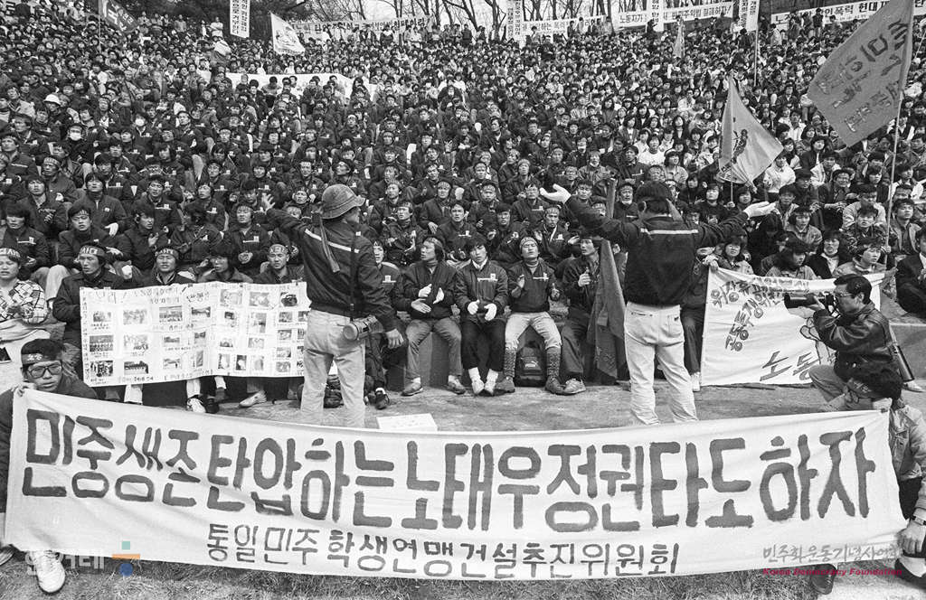 - 1989년 3월 12일 오후 2시 현대재벌 폭력테러규탄 국민대회가 서울 연세대 노천극장에서 열려 전국 노동법개정 및 임금인상 투쟁본부 전민련 전대협 등 3개 단체 주최로 노동자 학생 등 1만여명이 참석한 가운데 열리고 있다.