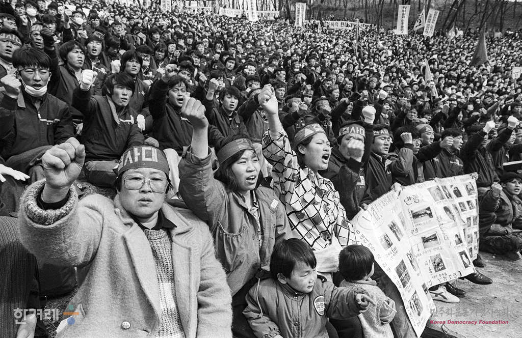- 1989년 3월 12일 오후 2시 현대재벌 폭력테러규탄 국민대회가 서울 연세대 노천극장에서 열려 전국 노동법개정 및 임금인상 투쟁본부 전민련 전대협 등 3개 단체 주최로 노동자 학생 등 1만여명이 참석한 가운데 열리고 있다.