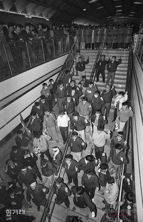 - 1989년 3월 13일 오후3시 서울시 지하철공사 노동쟁의는 파업시한을 앞두고 서울지하철공사 노조원 1천여명이 서울 지하철 3호선 경복궁역 구내에 모여 중앙청을 향해 행진하려고 계단을 올라오자 출동한 경찰이 저지하고 있다.