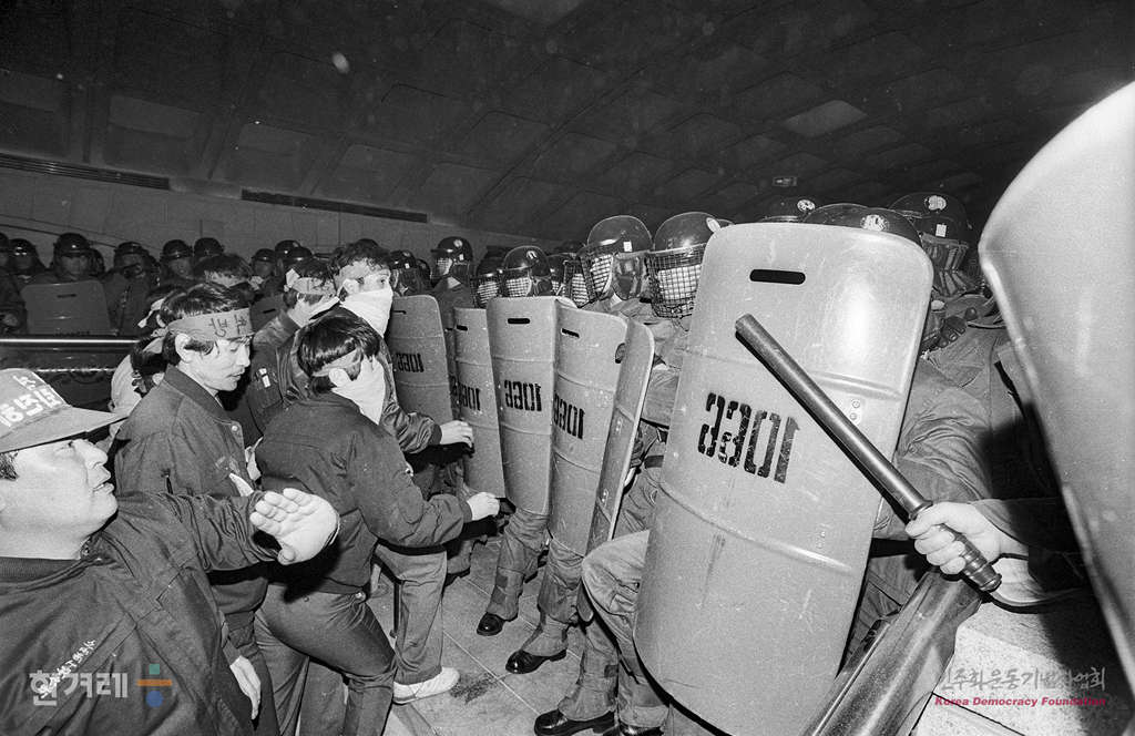 - 1989년 3월 13일 오후3시 서울시 지하철공사 노동쟁의는 파업시한을 앞두고 서울지하철공사 노조원 1천여명이 서울 지하철 3호선 경복궁역 구내에 모여 중앙청을 향해 행진하려고 계단을 올라오자 출동한 경찰이 저지하고 있다.