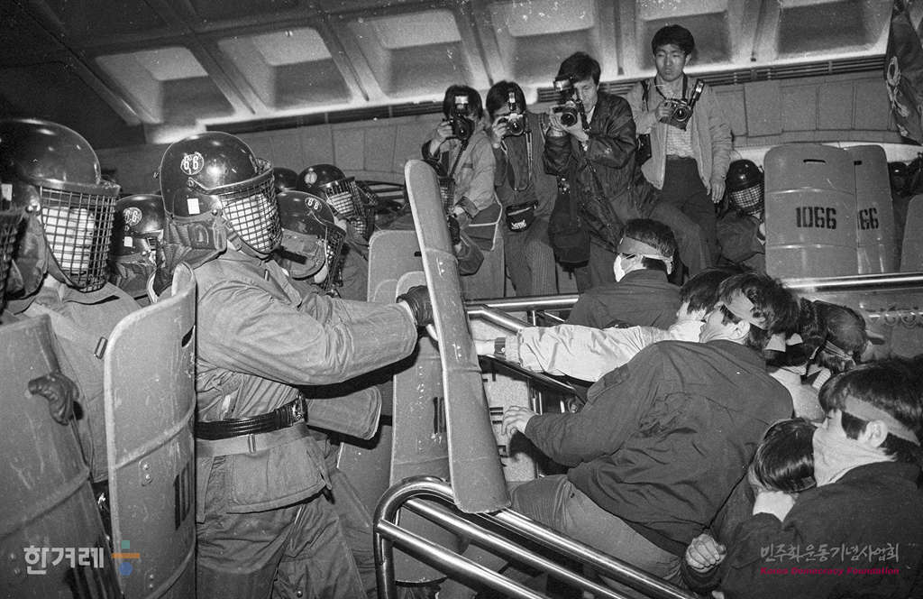 - 1989년 3월 13일 오후3시 서울시 지하철공사 노동쟁의는 파업시한을 앞두고 서울지하철공사 노조원 1천여명이 서울 지하철 3호선 경복궁역 구내에 모여 중앙청을 향해 행진하려고 계단을 올라오자 출동한 경찰이 저지하고 있다.