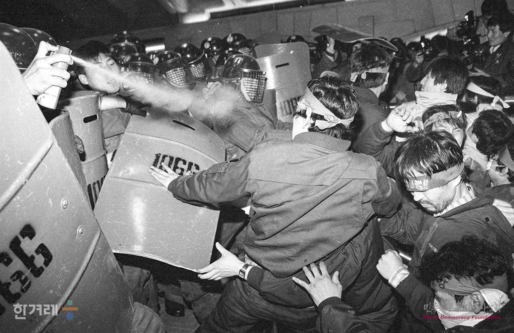 - 1989년 3월 13일 오후3시 서울시 지하철공사 노동쟁의는 파업시한을 앞두고 서울지하철공사 노조원 1천여명이 서울 지하철 3호선 경복궁역 구내에 모여 중앙청을 향해 행진하려고 계단을 올라오자 출동한 경찰이 저지하고 있다.