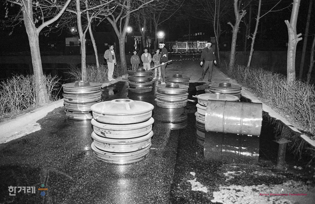 - 1989년 3월 15일 서울지하철노조 조합원들이 파업을 앞두고 서울 성동구 용답동 지하철기지에 모여 경찰이 원천봉쇄한다는 정보에 따라 각 출입문을 폐쇄하고 경찰투입에 대비하고 있다.