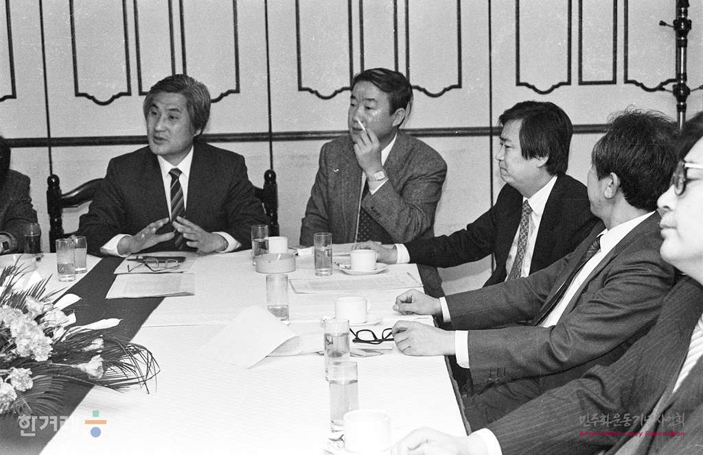 - 1989년 3월 16일 오전 9시 노동현장의 민주화를 염원하는 교수들 4백87명을 대표해 서울대 김진균교수를 비롯한 6명의 교수들이 서울 중구 정동 세실레스토랑에서 현대노동자들의 생존권확보투쟁 지지하는 성명서를 발표하고 있다.