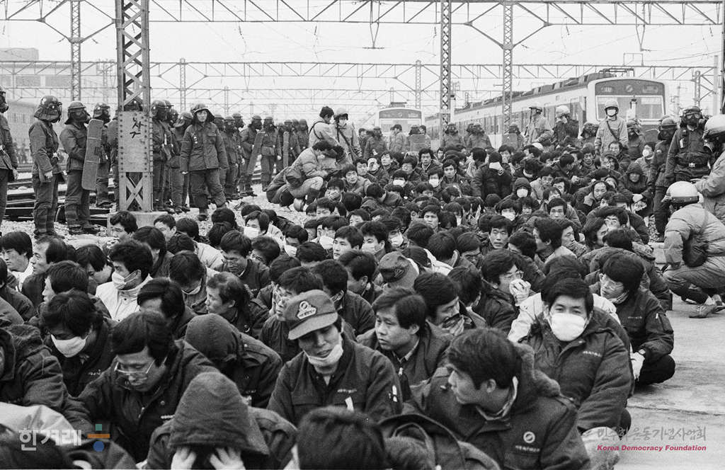 - 1989년 3월 16일 오전 4시 합의각서 이행 등을 촉구하며 군자차량기지에서 파업농성에 들어갔던 서울지하철 노조원들이 파업 1시간 30분만에 개시된 경찰의 전격적인 진압작전으로 정윤광 노조위원장을 비롯한 많은 노조원들이 연행되고 있다.