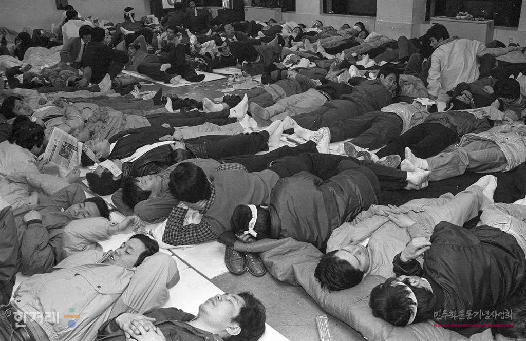 - 1989년 3월 16일 오전 10시 합의각서 이행 등을 촉구하며 군자차량기지에서 파업농성에 들어갔던 서울지하철 노조원들이 파업 1시간 30분만에 개시된 경찰의 전격적인 진압작전으로 정윤광 노조위원장을 비롯한 많은 노조원들이 연행된 가운데 연행되지 않은 지하철노조원 3백여명은 서울 마포구 공덕동 통일민주당사에 모여 연행자 전원석방 등을 요구하며 농성을 벌이고 있다.