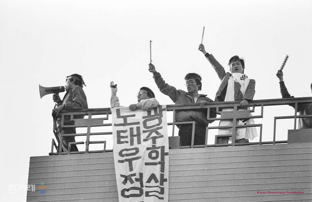 - 1989년 3월 17일 오전 7시25분 성균관대 동국대 등 서총련 산하 서울시내 11개대학 광주학살 부정비리 주범 노태우 정권 퇴진을 위한 애국결사대 학생 20명이 서울 종로구 관훈동 민정당 중앙당사 본관 9층 옥상을 점거하고 노태우정권 퇴진을 주장하며 30여분 동안 시위를 벌이다 출동한 경찰에 모두 연행되고 있다.